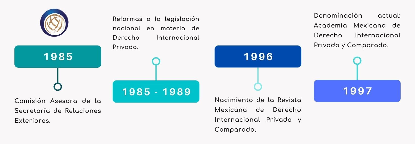 La Academia Mexicana de Derecho Internacional Privado y Comparado A.C. nació el 12 de julio de 1979, a iniciativa de un grupo de profesores de Derecho Internacional Privado preocupados por el desarrollo progresivo de la materia. Sin embargo, la Academia cuenta con una serie de antecedentes y etapas de crecimiento que ilustran la transformación que se ha vivido hasta la fecha.